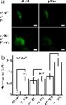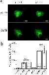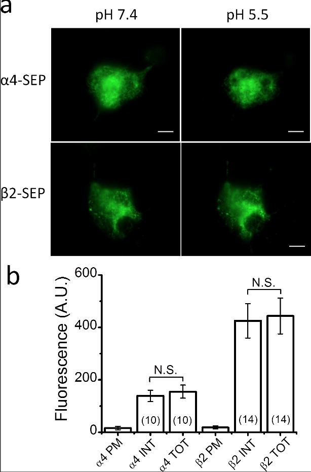 Transfection of just α4 or β2 cDNA without the complementary subunit failed to produce significant α4 or β2 protein expression in the plasma membrane (PM). The α4 and β2 subunits were tagged with superecliptic pHluorin (SEP) and imaged with total internal reflection fluorescent (TIRF) microscopy. a. TIRF images of N2a cells expressing SEP-tagged α4 (α4-SEP) (top row) and β2 subunits (β2-SEP) (bottom row) at an extracellular pH of 7.4 (left column) and 5.5 (right column). The absence of a significant effect of extracellular pH on cellular fluorescence shows that SEP-tagged protein expression on the PM was negligible. Scale bars are 10 μm. b. The bars are the internal (INT), total (TOT), and PM fluorescent intensity measured in arbitrary units (A.U.) for N2a cells transfected with α4-SEP or β2-SEP cDNA. Internal and total fluorescence was not significantly different (N.S.) for the α4-SEP, or β2-SEP, subunit.