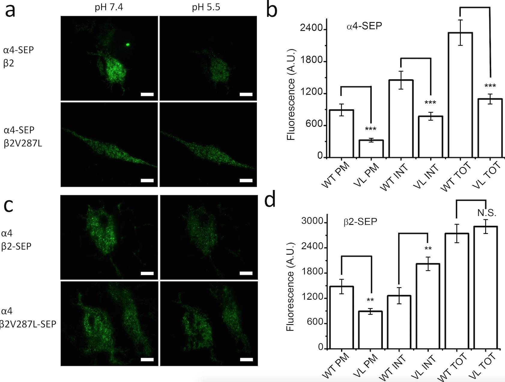 a. TIRF images of α4-SEP fluorescence in N2a cells transfected with α4-SEPβ2 (top row), or α4-SEPβ2V287L, cDNA (bottom row) at an extracellular pH of 7.4 (left column) and pH 5.5 (right column). Reducing the pH from 7.4 to 5.5 dimmed cellular fluorescence because surface SEP-tagged subunits do not fluoresce at pH 5.5. Scale bars are 10 μm. b. The bars (from left to right) are the PM, INT, and TOT fluorescent intensities for cells transfected with α4-SEPβ2 (WT) or α4-SEPβ2V287L (VL) cDNA. The β2V287L mutation significantly (p < 0.001,***) reduced the TOT, INT, and PM α4-SEP fluorescence. c. Images of β2-SEP fluorescence in cells transfected with α4β2-SEP (top row), or α4β2V287L-SEP, cDNA (bottom row) at an extracellular pH of 7.4 (left column) and pH 5.5 (right column). d. The bars are the PM, INT, and TOT fluorescent intensities for cells transfected with α4β2-SEP (WT) or α4β2V287L-SEP (VL) cDNA. The β2V287L mutation significantly (p < 0.001) reduced PM β2-SEP fluorescence, but did not affect TOT fluorescence. It also significantly (p < 0.01,**) increased INT fluorescence.