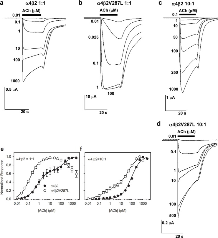 Fig 3. WT and mutant ACh concentration-response relations using unbiased and α4-biased subunit injection ratios.The α4β2 and α4β2V287L receptors were expressed in Xenopus oocytes using either a 1:1 (a-b, e) or 10:1 α4:β2 mRNA injection ratio (c-d, f). a-b. the traces are voltage-clamped ACh responses of oocytes injected with α4β2 (a) or α4β2V287L (b) in a 1:1 α4:β2 stoichiometric ratio (w/w). The ACh concentrations (in μM) are listed on the left of, or below, the traces. The bars above the traces show the timing and duration of the ACh application. The downward deflections of the trace are ACh-induced inward currents. For clarity, only a subset of the 18 responses recorded from each oocyte is shown. c-d, Voltage-clamped α4β2 (c) and α4β2V287L responses (d) using a 10:1 α4:β2 injection ratio. e-f. Normalized ACh concentration-relations for the α4β2 (filled circles) and α4β2V287L nAChRs (open circles) using 1:1 (e) and 10:1 (f) α4:β2 injection ratios. Lines are fits to the sum of two hyperbolic binding components using non-linear least-squares regression, subject to the constraints described in the text (Results). The data or individual oocytes were normalized to the observed maximum response for each oocyte, pooled across oocytes, and re-normalized to the fitted maximum response (Methods). Symbols are the means of 7–17 oocytes. Error bars are SEMs in this, and subsequent, figures (obscured by the symbols at some ACh concentrations). Holding potential = -60 mV.