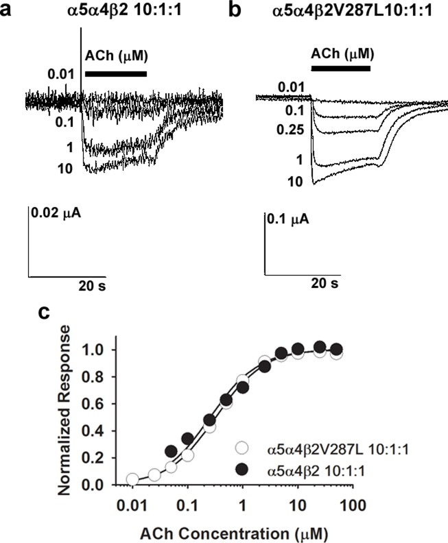 Fig 4. ACh concentration-response relations for α5α4β2 and α5α4β2V287L nAChRs.The α5α4β2 and α5α4β2V287L receptors were expressed in Xenopus oocytes using a large excess of α5 mRNA (α5:α4:β2 mRNA injection ratio of 10:1:1 w/w/w) to ensure that α5-containing (α5*) nAChRs were the predominantly expressed subtype. a-b. Voltage-clamped ACh responses of oocytes expressing α5α4β2 (a) or α5α4β2V287L receptors (b). c. Normalized ACh concentration-relations for the WT α5α4β2 (filled circles), and mutant α5α4β2V287L (open circles), nAChRs superimpose. The lines are fits to a single hyperbolic binding component using non-linear least-squares regression. The data for both receptors were normalized to the fitted maximum response to facilitate comparison of their ACh sensitivities. Symbols are the means of 4–8 oocytes. Holding potential = -60 mV.