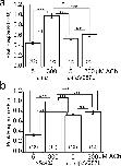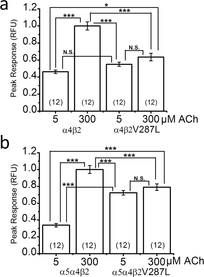 Fig 5. Fluorescent responses of α4β2, α4β2V287L, α5α4β2, and α5α4β2V287L nAChRs to 5 and 300 μM ACh.ACh responses were measured using a membrane-potential-sensitive fluorescent dye. a. The bars are peak responses to 5 and 300 μM ACh of α4β2 (WT) and α4β2V287L (mutant) receptors (measured in relative fluorescent units (RFU)). HEK cells were transfected with α4 and β2 cDNA in a 1:1 stoichiometric ratio (w/w). The WT and mutant responses were measured in matched groups of cells transfected on the same day, incubated for the same time, and tested on the same day. All responses were normalized to the peak WT 300 μM ACh response. Sample sizes (n = number of culture wells) are given in parentheses inside the bars. Connecting lines above the bars in this, and subsequent, figures indicate statistical comparisons between various groups. Asterisks give the significance levels for post hoc comparisons between the groups. Not significant (N.S.) b. Similar analysis for HEK cells transfected with α5α4β2 (WT), or α5α4β2V287L (mutant), cDNA in a 1:1:1 α5:α4:β2 stoichiometric ratio.