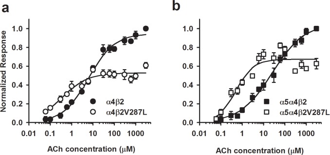 Fig 6. ACh concentration-response relations for α4β2, α4β2V287L, α5α4β2, and α5α4β2V287L nAChRs using a membrane-potential dye.a. β2V287L shifted the α4β2 ACh concentration-response to the left and reduced the maximum response. The data were normalized to the 1 mM ACh α4β2 response. The filled circles are α4β2 responses, and the open circles, α4β2V287L responses. The lines are fits to the three-parameter Hill equation (see Table 2 for the fitted parameters). b. Co-expression with α5 increased the maximum response of cells transfected with the mutant receptor cDNA (α5α4β2V287L) relative to the WT control (α5α4β2). The data were normalized to the 1 mM ACh α5α4β2 response. The α5:α4:β2 cDNA transfection ratio was 1:1:1 (w/w). The filled squares are α5α4β2 responses, and the open squares, α5α4β2V287L responses. All else was the same as in a.