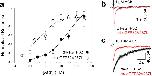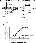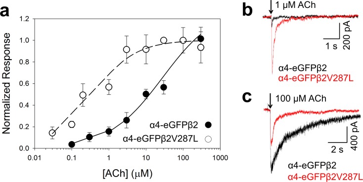 Fig 7. β2V287L increased the ACh sensitivity of α4β2 nAChRs in N2a cells but reduced maximum response.The α4 subunit was labeled with an enhanced green fluorescent protein (eGFP) tag to facilitate the identification of cells expressing α4β2 nAChRs. The cells were voltage-clamped at -60 mV in whole-cell mode. a. Normalized ACh concentration-response relations for the α4-eGFPβ2 (filled circles) or α4-eGFPβ2V287L receptors (open circles). The α4-eGFPβ2 and α4-eGFPβ2V287L ACh responses were normalized to the peak 100 μM response. The α4-eGFPβ2 symbol at 100 μM ACh is obscured by that for α4-eGFPβ2V287L. The dashed (α4-eGFPβ2V287L) and solid lines (α4-eGFPβ2) are fits to the three-parameter Hill equation (see text for values of fitted parameters). b-c. Superimposed traces of α4-eGFPβ2 (black) and α4-eGFPβ2V287L (red) responses to 300 ms applications of 1 (b) and 100 μM ACh (c). At 1 μM ACh, the α4-eGFPβ2V287L response was larger than α4-eGFPβ2 response. At 100 μM ACh, it was smaller. Downward arrows denote the onset of a 300 ms ACh application.