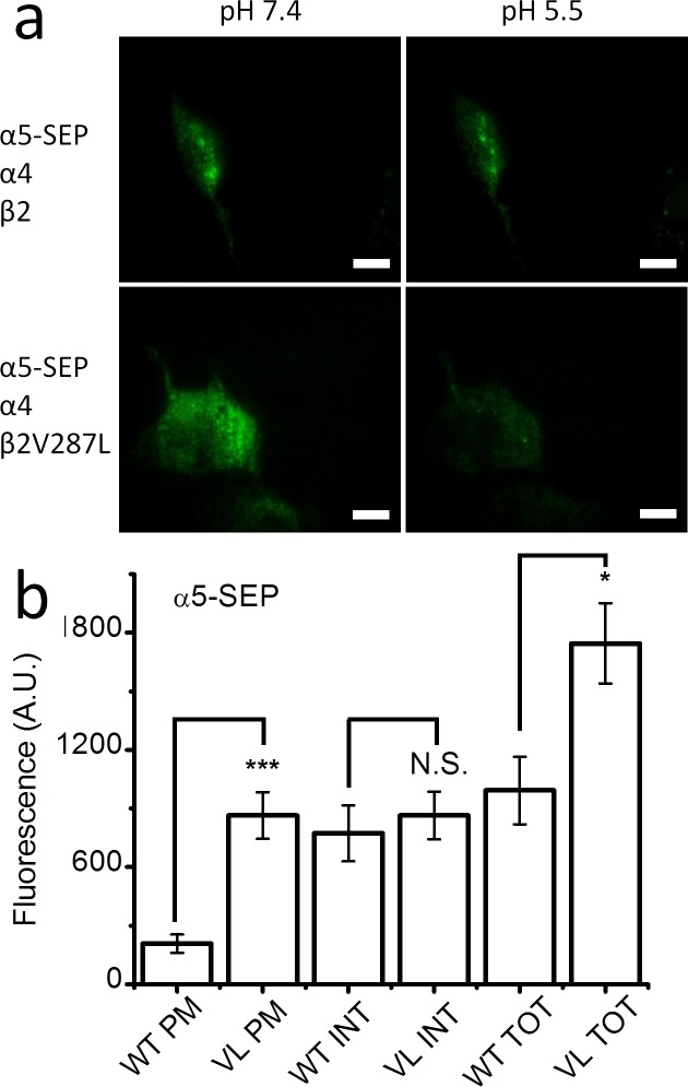 Fig 8. β2V287L increased α5 incorporation into surface α4β2* nAChRs.a. TIRF images of α5-SEP fluorescence in N2a cells co-transfected with α5-SEPα4β2 (top row), or α5-SEPα4β2V287L, cDNA (bottom row) at an extracellular pH of 7.4 (left column) and pH 5.5 (right column). b. Bar graphs of the PM, INT, and TOT fluorescent intensities of cells transfected with α5-SEPα4β2 (WT) or α5-SEPα4β2V287L (VL). The β2V287L mutation significantly (p < 0.001,***) increased TOT and PM α5-SEP fluorescence but did not affect INT fluorescence.
