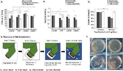 Fig 2. Mechanical and Material Properties of the Device.(A) Change in Stiffness of Hydrogel insert Pre and Post (24 hr) Device Attachment with varying gelation parameters (B) Contraction rate of hydrogel inserts with varying gelation conditions (C) Loss of mass of hydrogel over different time periods of attachment (D) Schematic of the silk hydrogel’s dynamic nature during device attachment. (E) Images of two HRP silk hydrogels. One of the hydrogels was cast with frog water (FW) in its gelation solution, while the other hydrogel had only distilled water (diH2O) in its gelation solution. Images are taken at time of gelation, and one hour after gelation. (Statistical significance: * for p < 0.05, ** for p < 0.01, and *** for p < 0.001).