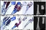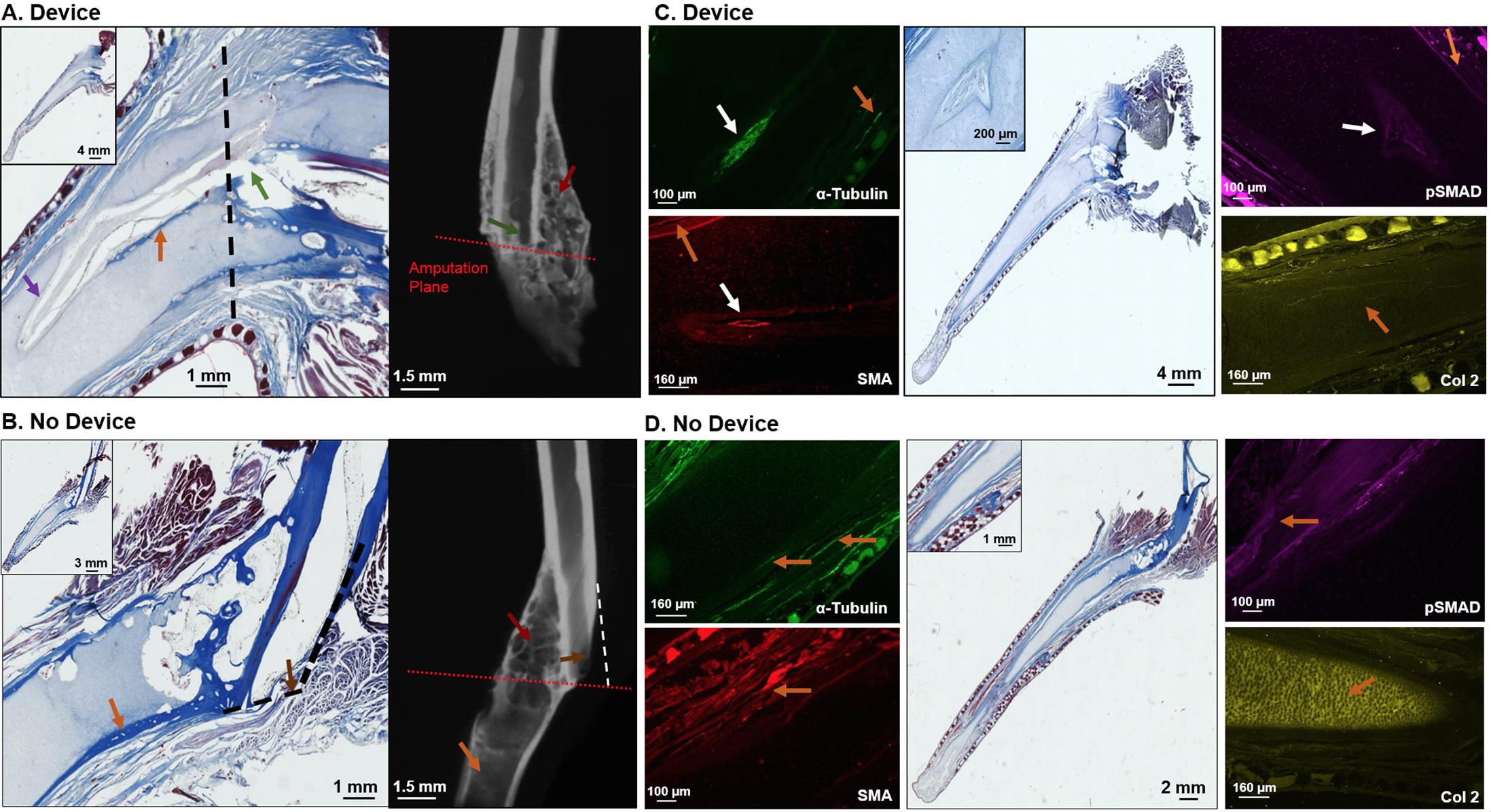Fig 4. Histology, Immunohistology, and Micro-CT Images of Spike Formation from Animals. (A) and (B) Histology and Micro-CT. Red Arrows: Porous calcified tissue growth or old bone growth remodeling. Signs of osteoblast and osteoclast reconstruction can be observed in the tissues dense structure that is filled with marrow pockets. Orange Arrow: Bony callus formation, this is typically connected to the old bone around the amputation site and is hollow. Black Arrows: Formation of hyaline cartilage behind the old bone. Green Arrow: Connection site of old marrow cavity to new tissue growth. Brown Arrow: Signs that the old marrow cavity did not connect with the new tissue growth. Purple Arrow: Invasion of tissue into the cartilagespike core. (C) and (D) Immunohistological Stains. Green: Acetyl- N-Alpha Tubulin (α-Tubulin) (Nerve) Red: Smooth Muscle Actin (SMA) (Vasculature) Yellow: Collagen type II (Col2) (cartillage type II only found in abundance in hyaline cartilage) Purple: Phosphorylated Mothers Against Decapentaplegic Homolog (pSMAD 5/9) (TGF-β activator, signs of proliferation and differentiation/ not cartilage behavior) Orange Arrow: Location where protein would be typically found in spike. White Arrow: Location where protein would not be typically found in spike.