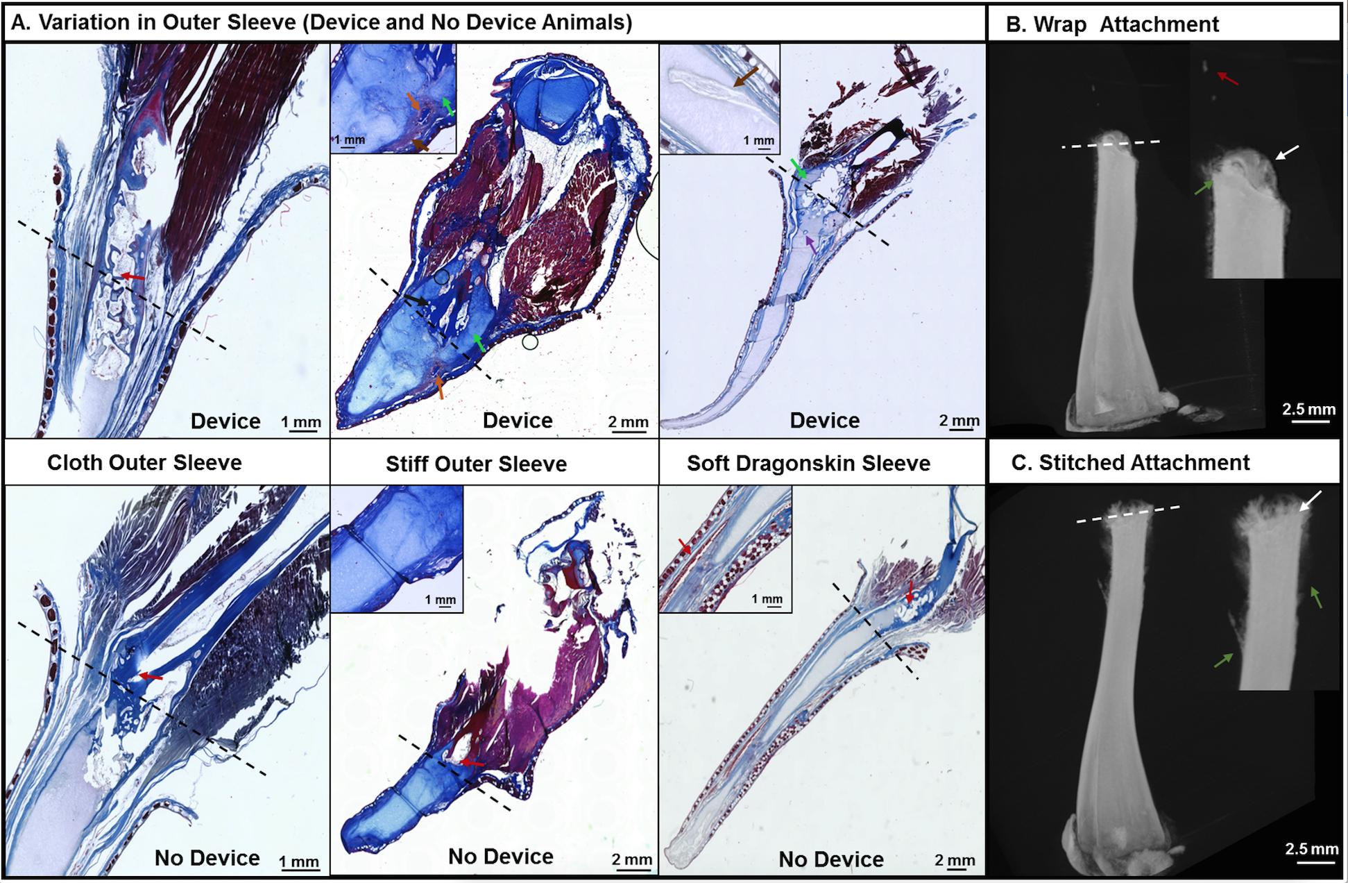 Fig 5. Histology and Micro-CT of Animals with Variations in Technical Design. (A) Variations Observe in Different Outer Sleeve Design. Red Arrow: Signs of Spike core isolation Brown Arrow: Connection of center cartilagetissue with without outside tissue. Orange Arrow: Ectopic Bone Growth. Purple Arrow: Bone Marrow Pocket. Green Arrow: Cartilagetissue behind the old bone. (B) Variations Observed in Different Modes of Attachment. Red Arrow: Ectopic (beyond plane of amputation) calcified tissue formation Green Arrow: Calcified tissue behind site of amputation White Arrow: Calcified Tissue at the site of amputation.