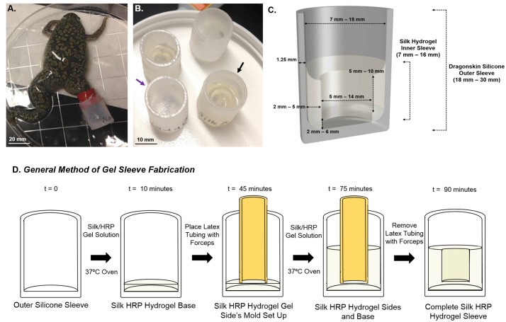 Fig 1. Design and Fabrication Process for the Device.(A) Image of the device attached to the animal using a silicone wrap for attachment. (B) Final version of the soft Dragonskin. The purple arrow points out a device with an outer sleeve with no inner hydrogel insert, while the black arrow points out an experimental device with a hydrogel. (C) Schematic of the outer silicone and silk hydrogel insert. (D) Diagram of the hydrogel insert fabrication process.