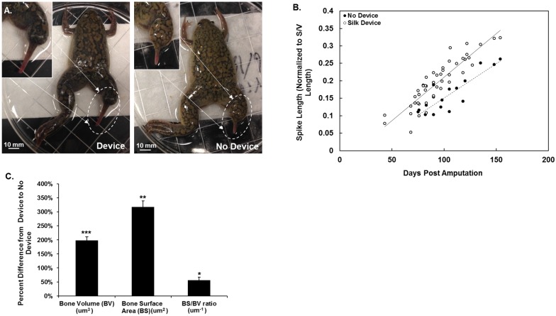 Fig 3. Measurements and Micro-CT Analysis of Animals.(A) Resultant spike with animals with and without device attachment (B) Non-destructive measurements of animals with and without device. (C) Micro-CT bone volume and surface area of animals that had a device attached versus those who did not. (Statistical significance: * for p < 0.05, ** for p < 0.01, and * for p < 0.001).
