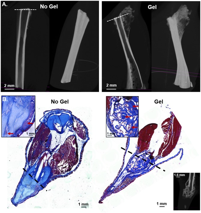 Fig 6. Morphological Differences in Device Animals with (Hydrogel) and without (No Hydrogel) Hydrogel inserts.(A) Micro-CT of the change in calcified tissue in two animals in the current soft Dragonskin generation of the device. (B) Comparison of resultant morphological outcomes with a stiff outer sleeve device, with and without the hydrogel insert. The hydrogel animal has an additional Micro-CT image in order to confirm that the observed changes in the histological stain are not due to tissue processing error. The dotted line represents the point of amputation.