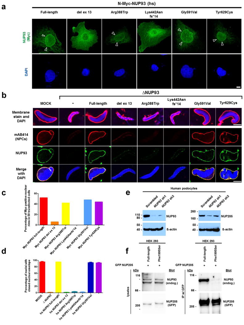 Nucleoporins are essential components of the nuclear pore complex (NPC). Only a few diseases have been attributed to NPC dysfunction. Steroid-resistant nephrotic syndrome (SRNS), a frequent cause of chronic kidney disease, is caused by dysfunction of glomerular podocytes. Here we identify in eight families with SRNS mutations in NUP93, its interaction partner NUP205 or XPO5 (encoding exportin 5) as hitherto unrecognized monogenic causes of SRNS. NUP93 mutations caused disrupted NPC assembly. NUP93 knockdown reduced the presence of NUP205 in the NPC, and, reciprocally, a NUP205 alteration abrogated NUP93 interaction. We demonstrate that NUP93 and exportin 5 interact with the signaling protein SMAD4 and that NUP93 mutations abrogated interaction with SMAD4. Notably, NUP93 mutations interfered with BMP7-induced SMAD transcriptional reporter activity. We hereby demonstrate that mutations of NUP genes cause a distinct renal disease and identify aberrant SMAD signaling as a new disease mechanism of SRNS, opening a potential new avenue for treatment.