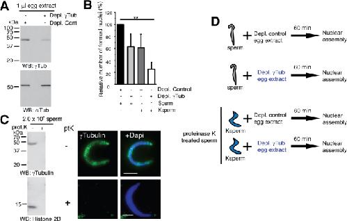 Fig. 3. Nuclear γ-tubulin is necessary for nuclear assembly. (A) Nuclear assembly was performed as in Fig. 2B. Egg extracts (egg extr.) were immunodepleted in the presence (Depl. γTub) or absence (Depl. Cont.) of an anti-γ-tubulin antibody by immunoprecipitation and protein levels of γ-tubulin and α-tubulin were analyzed by WB (n = 6). (B) Graph shows the mean percentage of formed nuclei in stage 3 and 4 relative to a control (black bar) in nuclear assembly reactions that were performed under the conditions described in D (± s.d., n = 3, ** p < 0.01). (C) Proteins associated with the demembranated sperm were degraded with proteinase K (ptK; Ksperm), as indicated and remaining protein levels of γ-tubulin and histone 2B were analyzed by western blotting (WB). The localization of γ-tubulin and chromatin in sperm were assayed by immunofluorescence with an anti-γ-tubulin antibody (green; ab27074) and by DAPI staining (blue; n = 3). (D) Schematic representation describing the conditions used during nuclear assembly assays. The figure shows representative images from at least ten experiments. Scale bars, 10 μm. |