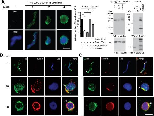 Fig. 1. Demembranated sperm contains γ-tubulin. (A) Sequence alignment of the variable region of human γ-tubulin 1 and γ-tubulin 2 and Xenopus laevis γ-tubulin, showing residues 334–451 of the C terminal region. Bold letters indicate differences. (B, C) The localization of γ-tubulin, histone 3, γ-tubulin ring complex (Xgrip109) and centrosome (centrin and αTub) were immunofluorescence stained in demembranated sperm (n = 5) with an anti-γ-tubulin antibody that was produced either in rabbit (γ-TubR; T3320) or mouse (γ-TubM; ab27074). (Da) Total lysates of egg extract and demembranated sperm were analyzed by western blotting with the indicated antibodies (n = 3; T3320). An actin and α-tubulin loading controls are shown. (Db) The indicated amount of egg extract (egg) and demembranated sperm (sperm) was analyzed by western blotting with the indicated antibodies (n = 6; T3320). An α-tubulin loading control is shown. (E) The anti-γ-tubulin antibody produced in rabbit or mouse (T3320 and ab27074) were preincubatd for 2 h with Ni2+ affinity resin (control) or with Ni2+ affinity resin associated with His6-tagged γ-tubulin (absorb. His6-γ-Tub) before immunofluorescence staining the sperm. In (B, C, E) γ-tubulin is shown as green and histone 3 as red and nuclei as blue (DAPI). In (C) Xgrip109 and γTub are shown as green and red, respectively. Scale bars, 10 μm. |