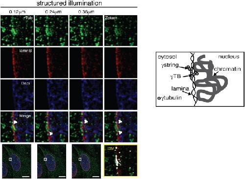 Fig. 8. γ-strings are intertwined with the lamina meshwork. Localization of endogenous γ-tubulin with an anti-γ-tubulin (T6557; green), lamina with an anti-lamin B (laminB; red) antibody and nuclei with DAPI (blue) were examined in U2OS cells in interphase. Structured illumination images are the mid planes of the nuclear compartment of a U2OS cell. Z-stack images were collected at 0.12 μm intervals. Z-stack shows average intensity projection of the displayed three Z-stack images. The white box shows the magnified areas. Arrowheads show protein bridges of γ-tubulin. The yellow box shows colocalization pixel-map (CM) of the red and green channels. White areas in CM denote colocalized pixels between channels. The figure shows representative images from four experiments. Scale bars, 10 μm. Right panel, γ-tubulin forms strings (γstrings) that act as protein bridges (γTB) between the cytosolic and the nuclear compartment. In their way into the nucleus, a γ-string goes through the nuclear lamina. |