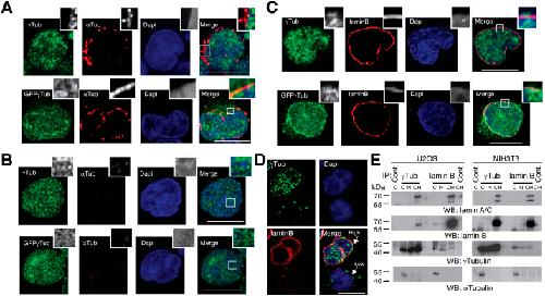 Fig. 13. γ-Tubulin forms a boundary on the cytosolic side of the nucleus and its disruption affects the integrity of the lamina. (A-D) Confocal images of isolated nuclei purified in the absence (A) or presence (B-D) of cytochalasin B and colcemid from U2OS (γTub) and stable γTUBULIN shRNA-GFP-γ-tubulinresist (GFPγTub) and γTUBULIN shRNA expressing cells. (A-C) White borders show the magnified areas displayed in the insets: the γ-string meshwork on the nuclear envelope (A-C), the γ-string boundary (A, B), chromatin-associated γ-strings (B) or γ-string bridges (C). In (A-D) γ-tubulin (γTub; green, T3320), α-tubulin (αTub; red) and lamin B (laminB; red) are shown as immuofluorescence staining and nuclei were detected with DAPI (blue). (D) shows the endogenous expression of lamin B and γ-tubulin in two nuclei containing either high or low γ-tubulin expression, as indicated. (A-D) Scale bars, 10 μm. (E) U2OS and NIH3T3 cells (20 × 106 cells) were biochemically divided into cytosolic [C], nuclear membrane [N], and chromatin [CH] fractions. Each fraction was subjected to immunoprecipitations (IP) with an anti-γ-tubulin (γTub; T6557), anti-lamin B or anti-GFP (Cont.) antibody, as indicated, and developed by WB with antibodies against lamin A/C, lamin B, γ-tubulin (T5192) and α-tubulin antibody (n = 5). (A-E) The figure shows representative images from at least five experiments. See also Fig. S1. |