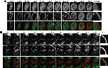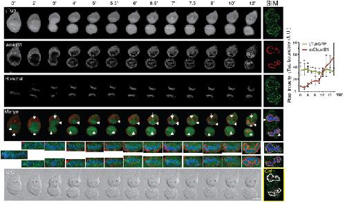 Fig. 14. Lamin B1 assembles at the γ-tubulin boundary. The DIC/fluorescence images show time-lapse series from a stable γTUBULINsh-U2OS cell co-expressing GFP-γ-tubulinresist (γTub; green) that was transiently expressing mCherry-lamin B1 (lamB1; red). The image series show chosen frames of the lamina (laminB1) formation at the γ-string boundary (cytosolic and chromatin-associated γ-strings) formed by GFP-γ-tubulinresist during nuclear assembly in a mitotic cell. The mitotic chromosomes/daughter nuclei are magnified below the merged images. Arrowheads and arrows show the γ-string-boundary around the mitotic chromosomes and the mitotic spindle, respectively. The graph shows the time-dependent changes in fluorescence intensity across the white box at the γ-string-boundary of γtubGFP (green) and mCherry-lamin B1 (mChlmB1; red) expressed in arbitrary units (AU; mean ± s.d.; n = 3). Right, structured illumination microscope (SIM) images show immunofluorescence staining of endogenous γ-tubulin and lamin B with an anti-γ-tubulin (green; T6557) and anti-lamin B1 (red) antibody of newly formed U2OS daughter cells. Nuclei were detected with DAPI (blue). The yellow box shows colocalization pixel-map (CM) of the red and green channels. White areas in CM denote colocalized pixels between channels. Scale bars, 10 μm. See also movie S1. |