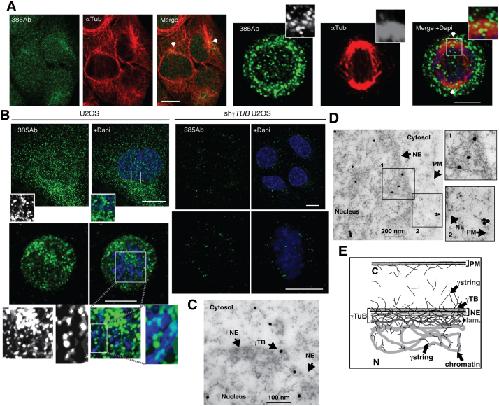 Fig. 18. Anti-γ-tubulin antibodies against Ser385-γ-tubulin recognize chromatin-associated γ-strings. (A, B) The fluorescence images show representative images of immunostained U2OS and stable γTUBULINsh-U2OS cells with 385Ab (green) in interphase and mitosis. Nuclei were detected with DAPI (blue). Scale bars, 10 μm. (A) Microtubules and centrosomes were stained with an anti-α-tubulin antibody (red). Arrowheads indicate the location of centrosomes. (C, D) Endogenous γ-tubulin detection in immunoelectron microscopy using 385Ab. Images show the plasma membrane [PM], cytosol, nuclear envelope [NE] and γ-tubulin bridges [γTB] of an interphase U2OS cell. (A-D) White and black boxes show the magnified areas displayed in the insets. (E) The γ-string meshwork is composed of treads (γ-string), which are attached to the plasma membrane [PM], found in the cytosolic [C] compartment and enter into the nuclear compartment [N] through the nuclear envelope [NE]. In the nuclear compartment, γ-strings are intertwined with the lamina [lam.] meshwork and with chromatin. γ-Tubulin bridges [γTB] connect the cytosolic and the nuclear γ-tubulin pools creating a nuclear boundary of γ-tubulin [γTuB]. |