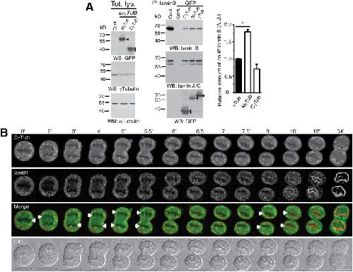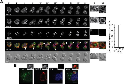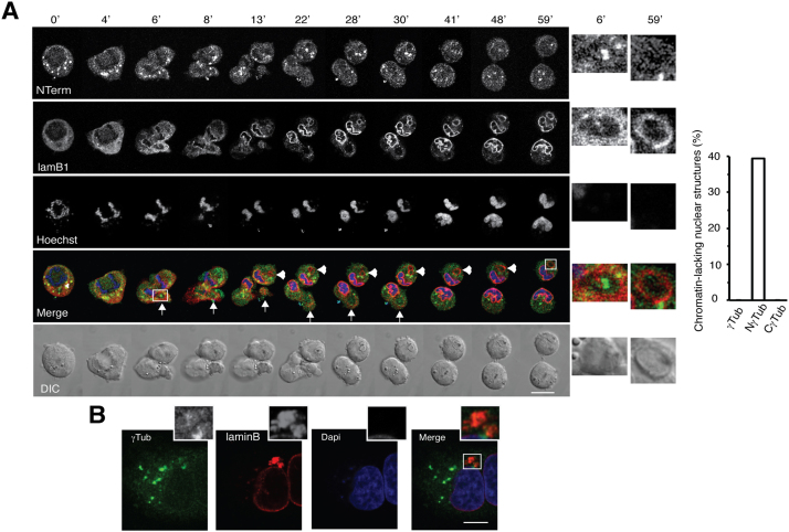 Fig. 20. The N-terminal region of γ-tubulin leads to the formation of chromatin-empty nuclei. (A) DIC/fluorescence images of time-lapse from a U2OS cell that is stably expressing both γTUBULIN shRNA and sh-resistant N-γtubGFP1–333 (NTerm, green), and transiently expressing mCherry-lamin B1 (lamB1; red) with Hoechst 33258 stained chromatin (blue), as indicated. The image series show the location of N-γtubGFP1–333 and lamin B1 in a mitotic cell that during nuclear assembly transiently formed two nuclear-like structures, which lack chromatin (arrowhead and arrow). Chromatin-lacking nuclear-like structures (white borders) are shown on the right images. Graph shows the percentage of filmed cells that formed chromatin lacking nuclear like structures. Images were collected every 30 sec. See also movie S5. (B) Fixed U2OS cells that are stably expressing γTUBULIN shRNA and N-γtubGFP1–333 were immunofluorescence stained with an anti-lamin B antibody (laminB; red) and nuclei were detected with DAPI (blue). (A, B) Scale bars, 10 μm. |
