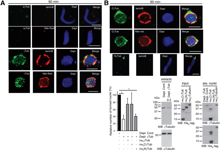 Fig. 5. Nuclear-γ-tubulin promotes the formation of the nuclear envelope and the lamina meshwork. (A, B) Ksperm were incubated in the presence of γ-tubulin immunodepleted egg extracts (Depl.) during 90 min before fixation or before spun down through a sucrose cushion for analysis by WB (ass. nuclei). Representative confocal fluorescence images of morphological changes of nuclei in stage 1 or 4 showing the location of endogenous γ-tubulin (eγTub, green) or bacterially produced His6–γ-tubulin (γTub, green), His6–C-γtub334–452 (CγTub, green) or His6–N-γtub1–333 (NγTub, green) of nuclei in stage 1 or 4. Localization of lamin B3 (lamin B; red) were examined by immunofluorescence staining with an anti-lamin B3 antibody and nuclear membranes and nuclei were detected with Nile red (red) and DAPI (blue), respectively. Localization of γ-tubulin, His6–γ-tubulin, His6–C-γtub334–452 and His6–N-γtub1–333 were immunofluorescence stained with either T3320 (eγTub, γTub, CγTub) or T5192 (NγTub). The figure shows representative images from at least five experiments. Scale bars, 10 μm. (B) Graph shows the mean percentage of assembled nuclei in stage 3 and 4 versus a control (black bar), with an anti-γ-tubulin antibody (open and grey bars) and with each form of His6–γ-tubulin (grey bars) added back (n = 3; * p < 0.05), as indicated. The amount of protein added back (input), the γ-tubulin level present in the extracts and the association of His6–γ-tubulin, His6–C-γtub334–452 and His6–N-γtub1–333 with assembled nuclei were analyzed by WB with the indicated antibodies. Numbers on WBs indicate the level of depletion of γ-tubulin in the extracts relative to control. To adjust for differences in protein loading, the protein concentration of γ-tubulin was determined by its ratio with α-tubulin for each sample. The protein ratio in control extracts was set to 1. |