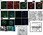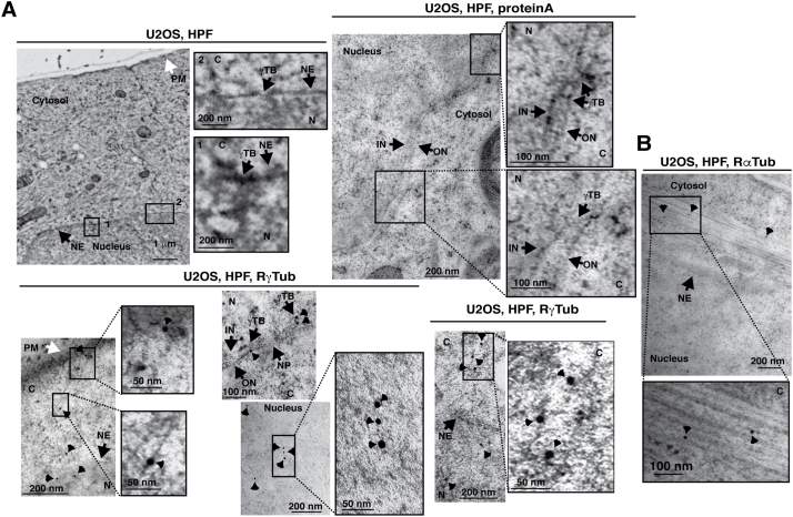 Fig. 11. The cytosolic and the nuclear pools of γ-tubulin are connected and form one protein meshwork. (A, B) Endogenous γ-tubulin detection in immunoelectron microscopy using three different conditions in high pressure frozen (HPF) U2OS cells: first, no antibody (A), second, gold conjugated protein A (A) and third, an anti-γ-tubulin antibody (T3320; A) and gold conjugated protein A (RγTub; A) or an anti-α-tubulin antibody and gold conjugated protein A (RαTub; B). Images show the plasma membrane [PM], cytosol [C], nuclear envelope [NE], inner [IN] and outer [ON] nuclear membranes and nucleus [N] and γ-tubulin bridges [γTB] of a U2OS cell. A black box shows the magnified area displayed in the inset. Black arrowheads show either immunolabeled γ-strings (RγTub) or immunolabeled microtubules (RαTub). Arrows show the indicated structure (n = 3). |