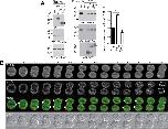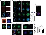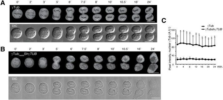 Fig. 16. The endogenous protein levels of γ-tubulin affect the association of GFP-γ-tubulin to chromatin. (A, B) The DIC/fluorescence images show time-lapse series from U2OS cells that stably expressed either C-terminal tagged GFP-γ-tubulin (γTub; A) or both γTUBULIN shRNA and N-terminal tagged GFP-γ-tubulinresist (γTubresistShγTUB; B). The image series show chosen frames of the variation over time in the amount of chromatin-associated GFP-γ-tubulin. Images were collected every 30 sec. Scale bars, 10 μm. (C) The graph shows the time dependent changes in fluorescence intensity across the chromatin of GFP-γ-tubulin expressed in arbitrary units (AU; mean ± s.d.; n = 3). |