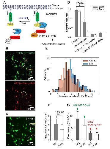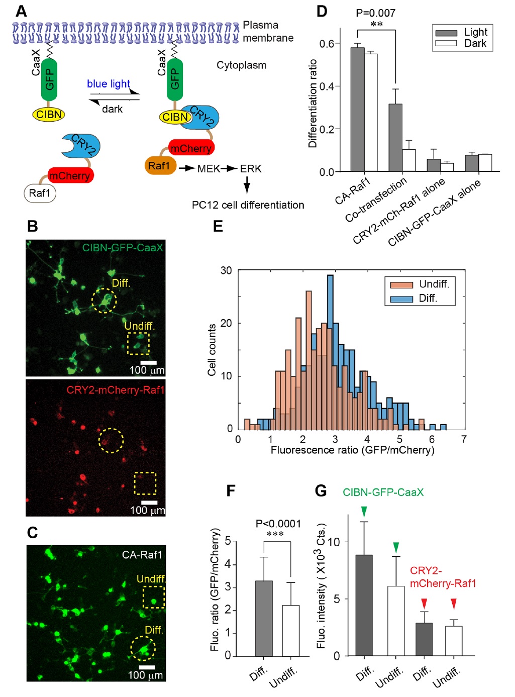 Fig. 1. Correlation between the differentiation ratio and the fluorescence intensity ratio (GFP/mCherry) in PC12 cells co-transfected with CIBN-GFP-CaaX and CRY2-mCherry-Raf1. (A) Light-induced binding between CIBN and CRY2 leads to membrane recruitment of CRY2-mCherry-Raf1, which activates the Raf/MEK/ ERK signaling pathway and induces PC12 cell differentiation. (B) Representative fluorescence images of PC12 cells co-transfected with CIBN-GFP-CaaX (green) and CRY2-mCherry-Raf1 (red). A differentiated cell is marked with a dashed circle; an undifferentiated cell is marked with a dashed square. Differentiated cells are defined as those with at least one neurite of length equal to or longer than the diameter of their cell bodies. (C) A representative image of cells transfected with Raf1- GFP-CaaX, a constitutively active Raf1 (CA-Raf1). A differentiated cell is marked with a dashed circle; an undifferentiated cell is marked with a dashed square. (D) Differentiation ratios of PC12 cells transfected with CA-Raf1, co-transfected with CRY2-mCherry-Raf1 and CIBN-GFP-CaaX, singly transfected with CRY2- mCherry-Raf1, or singly transfected with CIBN-GFPCaaX. Twenty four hours after transfection, cells were either exposed to light (0.2 mW/cm2) or incubated in the dark for another 24 h. Values represent mean±s.d. from four independent data sets. (E) Histograms of fluorescence intensity ratio (GFP/mCherry) for differentiated and undifferentiated cells in co-transfected cultures. Number of cells analyzed: differentiated cells (n=430), undifferentiated cells (n=430). (F) Quantification of GFP/mCherry ratio for the data shown in E. Values represent mean±s.d. Differentiated cells show a significantly higher GFP/mCherry ratio than undifferentiated cells. P-value was determined by a two-tailed, unpaired t-test. (G) Fluorescence intensities of GFP and mCherry in differentiated and undifferentiated cells. Values represent mean±s.d. P-values (D,F) were determined by a two-tailed, unpaired t-test. |