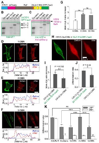 Fig. 3. Characterization of bicistronic constructs with varying number of CIBNs. (A) Schematic of the CRY2-2A-(n)CIBN construct. (B) An anti-GFP western blot analysis showing the expression of (n)CIBN-GFP-CaaX in BHK-21 cells transfected with bicistronic systems. The expected sizes of (n)CIBN-GFP-CaaX proteins are 48 kDa (single-CIBN), 68 kDa (double-CIBN), and 87 kDa (triple-CIBN). The cell culture co-transfected with CRY2-mCherry-Raf1/CIBN-GFP-CaaX (lane 1) shows a band at the position of single CIBN (lane 3). (C) The same blot consequently probed with anti-mCherry without stripping. All cell cultures show a primary band that corresponds to CRY2-mCherry-Raf1 (arrow, expected size 161 kDa) in the pink rectangle. (D-F) Confocal fluorescence imaging of cells transfected with CRY2-2A-(n)CIBN. The number of CIBN is 1 (D), 2 (E) and 3 (F). In each panel, the first panel shows cleaved (n)CIBN-GFP-CaaX localized on the plasma membrane; the second panel shows a snapshot of CRY2-mCherry-Raf1 before blue-light stimulation; the third panel shows a snapshot of CRY2-mCherry- Raf1 after ten pulses of blue-light stimulation. The bottom panel shows normalized intensity profiles across the cell (marked by yellow dashed line) before and after light stimulation. Blue light-induced membrane recruitment of CRY2-mCherry-Raf1 can be observed under all three conditions but to different extents. Scale bars: 10 μm. (G) Quantification of CRY2-mCherry-Raf1 membrane translocation. The membrane/cytoplasm mCherry intensity ratios were calculated before and after light stimulation. The fold increase was then calculated by dividing the after-stimulation ratio by the before-stimulation ratio. The single-CIBN construct is less effective at inducing membrane recruitment of CRY2-mCherry-Raf1 compared with the multiple-CIBN constructs. Number of cells analyzed: 1-CIBN (n=6), 2-CIBN (n=5), 3-CIBN (n=7). Values represent mean±s.d. (H) Supplementing 2A-CIBN-GFP-CaaX to CRY2-2A-CIBN improves the membrane translocation of cytosolic CRY2-mCherry-Raf1 after blue-light stimulation. The three images are GFP fluorescence (left), and mCherry fluorescence before (middle) and after (right) ten pulses of blue-light stimulation. (I) Fold increase of the membrane/cytoplasm ratio of CRY2-mCherry-Raf1 fluorescence intensity. Supplementing additional 2A-CIBN-GFP-CaaX improves the capacity for membrane recruitment of CRY2-mCherry-Raf1. Number of cells analyzed: CRY2-2A-CIBN+2A-CIBN-GFP-CaaX(n=6), CRY2-2A-CIBN (n=7). Values represent mean±s.d. (J) Supplementing additional 2A-CIBN-GFP-CaaX increases the differentiation ratio. Values represent mean±s.d. from two independent data sets for each condition. (K) Quantification of differentiation ratios for various transfection conditions. The double-CIBN construct shows the highest differentiation ratio, double that of co-transfected constructs and reaching the limit of CA-Raf1. The single- and triple-CIBN constructs show low differentiation ratios. Number of data sets analyzed: CA-Raf1 and all light conditions (n=4), all dark conditions (n=3). Note that data for CA-Raf1 and co-transfection are the same as those in Fig. 1D. They are presented here for easier comparison between differentiation ratios from all bicistronic constructs. Values represent mean±s.d. ***P<0.001; ns, not statistically significant. P-values were determined by two-tailed, unpaired t-tests. |