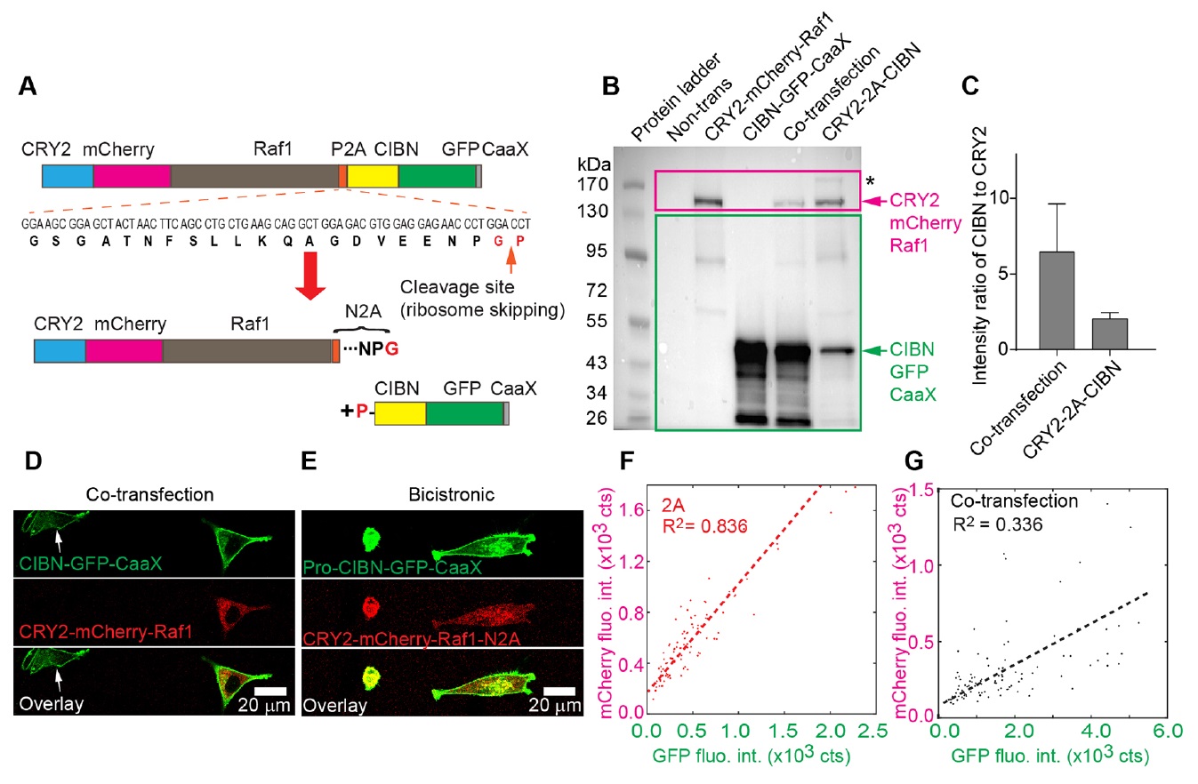 Fig. 2. Characterization of the bicistronic system based on the P2A peptide. (A) Design of CRY2-2A-CIBN, a bicistronic optogenetic system. Upon ribosomal skipping, one mRNA transcript generates two proteins: CRY2-mCherry-Raf1-N2A (ending with amino acids NPG) and proline-CIBN-GFP-CaaX. (B) Western blot analysis of the CRY2-2A-CIBN system in BHK-21 cells. The blot was probed sequentially with anti-GFP (bands in the green rectangle) and anti-mCherry (bands in the pink rectangle). A composite image is shown. Lane 1: protein ladder; lane 2: non-transfection; lane 3: CRY2-mCherry-Raf1 single transfection; lane 4: CIBN-GFP-CaaX single transfection; lane 5: co-transfection of CRY2-mCherry-Raf1 and CIBN-GFP-CaaX; lane 6: CRY2-2A-CIBN single transfection. Arrows show that sizes of cleaved products from CRY2-2A-CIBN match with that of singly transfected cells. The asterisk indicates residual full-length CRY2-2A-CIBN. (C) Quantification of the intensity ratio of CIBN-GFP-CaaX to CRY2-mCherry-Raf1 on western blot. Values represent mean±s.d. (n=4). (D) Confocal fluorescence images of BHK-21 cells that were co-transfected with CRY2-mCherry-Raf1 and CIBN-GFP-CaaX. A cell expressing CIBN-GFP-CaaX, but not CRY2-mCherry- Raf1, is marked (arrow). (E) In cell cultures that were transfected with CRY2-2A-CIBN, all cells show fluorescence in both GFP and mCherry channels. (F,G) Correlation analyses between CRY2-mCherry-Raf1 and CIBN-GFP-CaaX in co-transfected and CRY2-2A-CIBN transfected cells. Fluorescence intensities between mCherry and GFP arewell correlated (R2=0.836) in CRY2-2A-CIBN transfected cells (F) but are poorly correlated (R2=0.336) in co-transfected cells (G). Number of cells analyzed: CRY2-2A-CIBN (n=100), co-transfected (n=100). |