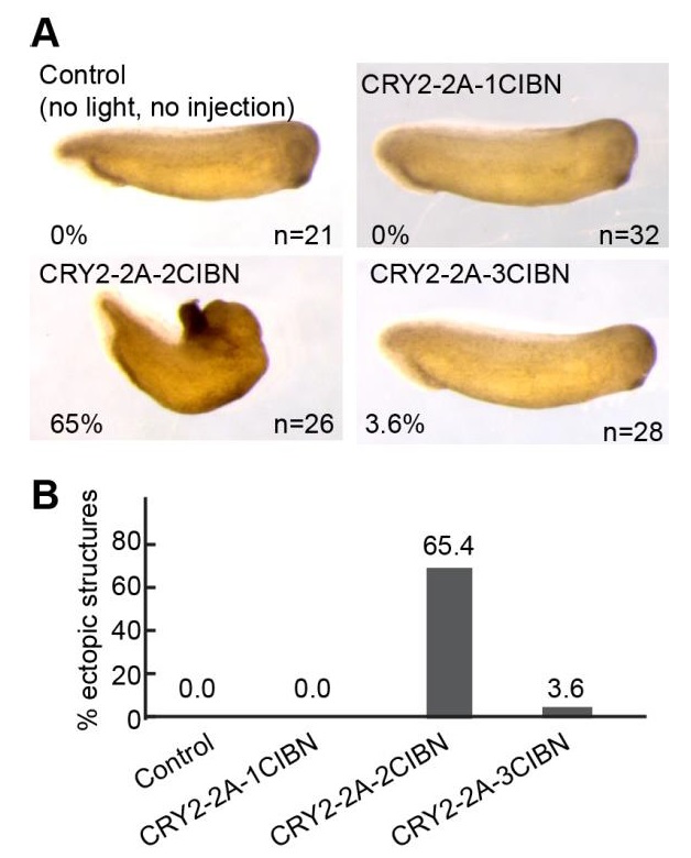 Figure S5. The 2-CIBN construct elicited higher percentage of ectopic tail-like structure than the 1- and 3-CIBN constructs. (A) Representative images of embryos at the late tailbud stage. Embryos were either uninjected (upper left), or injected with CRY2-2A-1CIBN (upper right), CRY2-2A- 2CIBN (lower left), and CRY2-2A-3CIBN (lower right) at the 4-cell stage. Light illumination was applied during stage 8-30. (B) Bar graph shows the percentage of embryos with ectopic tail-like structures. The 2-CIBN construct induced ectopic structure in more than 60% of all embryos examined, whereas the 1- and 3-CIBN only elicited 0% and 3.6%, respectively. |