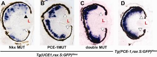rax-dependent UCE1 activity is mediated through the PCE-1 site. (aâc) Expression of the Tg(UCE1,rax.S:GFP)Hme transgene containing mutations in the Nkx site (a), PCE-1 site (b), or both (c). (d) Expression of Tg(PCE-1,rax.S:GFP)Hme transgene. Expression is visualized by in situ hybridization of sectioned retinal tissue using a GFP antisense riboprobe. Open arrowheads indicate lack of expression in the CMZ; black arrowhead indicates expression in the CMZ. L â lens. Sections are oriented so that the dorsal aspect of the embryo is toward the top of the figure.