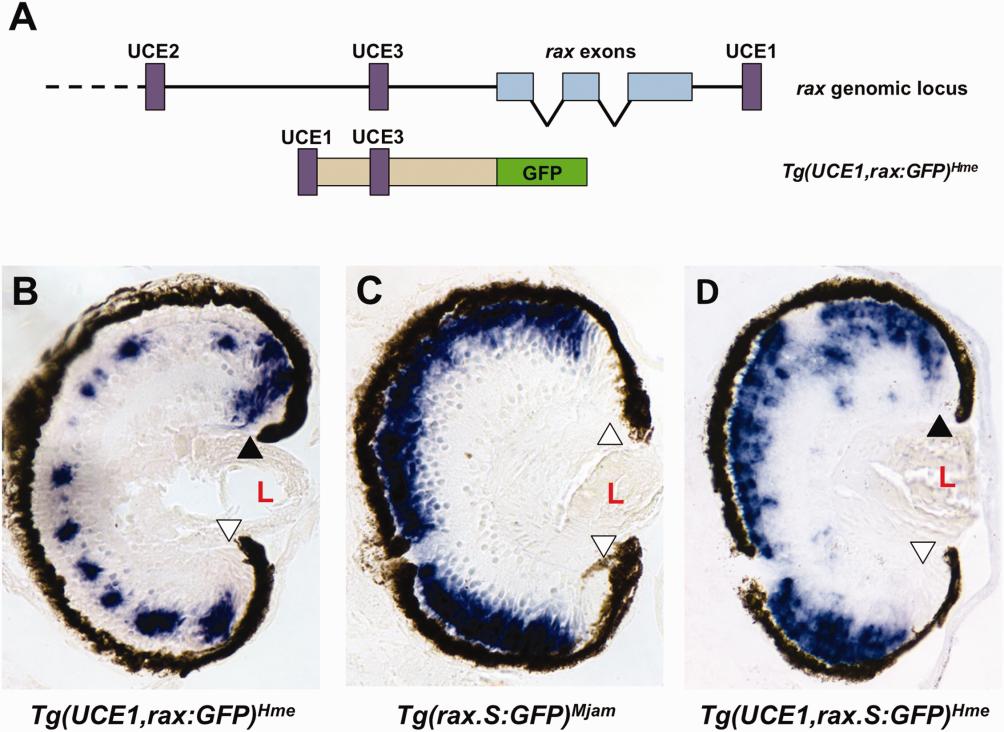 UCE1 drives transgene expression in the dorsal CMZ. (a). Schematic diagram of the rax genomic locus (top) and the Tg(UCE1,rax:GFP)Hme transgene. (b) Addition of UCE1 to the Tg(rax:GFP)Hme transgene results in expression in the dorsal CMZ but not the ventral CMZ. (c, d) Addition of UCE1 to the X. laevis rax.S promoter drives expression in the dorsal CMZ. (c) The X. laevis Tg(rax.S:GFP)Mjam transgene is not expressed in the CMZ (open arrowheads). (d) Addition of UCE1 to the Tg(rax.S:GFP)Mjam transgene results in expression in the dorsal CMZ (filled arrowhead). Transgene expression was visualized by in situ hybridization using a GFP antisense riboprobe (blue color). L â lens. Sections are oriented so that the dorsal aspect of the embryo is toward the top of the figure.