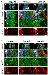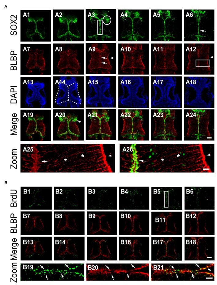 Figure 1. BLBP+ radial glia are SOX2+ cells in the Xenopus tectum. (A) Optic tectum were co-labeled with anti-SOX2 and anti-BLBP antibodies at stage 48. Six representative sections of the whole tectum were shown (A1âA6: SOX2; A7-A12: BLBP; A13âA18: DAPI and A19âA24: SOX2 and BLBP merged). Arrow heads indicate the endfeet of Radial glial cells (RGs; A12, A25, and A26); Arrows indicate cells stained for DAPI and SOX2; Stars indicate the processes of radial glia; White circle indicates the cluster of SOX2+ cells (A3); White square indicates the area for counting the number of BrdU+ cells (A3). Stars indicate the elongated processes of RGs (A25-A26). Scale: 100 μm (zoom in: 20 μm). (B) Tadpoles were incubated with BrdU for 2 h and co-labeled with anti-BrdU and anti-BLBP antibodies at stage 47. Six representative sections were shown (B1âB6: BrdU staining; B7âB12: BLBP staining and B13âB18: BrdU and BLBP merged). White square (B5) indicates the area for the zoom in images (B19âB21). Scale: 100 μm (zoom in: 20 μm).
