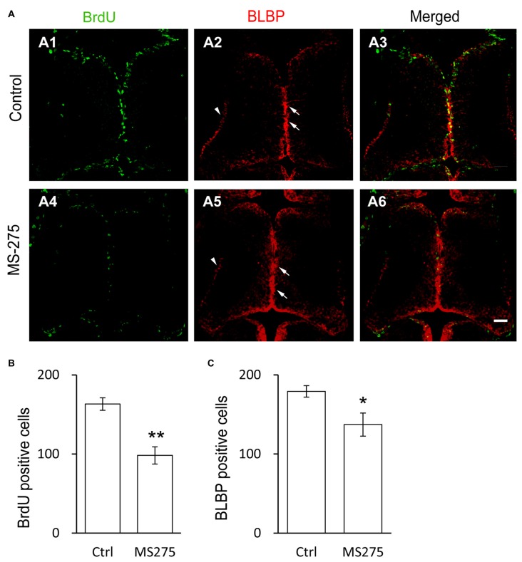 Figure 2. Class I HDAC inhibitor decreases the proliferative rate of radial glia cells. (A) Representative images showing the co-labeling for BrdU+ and BLBP+ in control (A1âA3) and MS-275-treated (10 μM, A4âA6) tecta. The BLBP+ cell bodies locate along the midline of the ventricular layer of the tectum (arrows) and the endfeet reside along the edge of neuropil (arrow heads). Scale: 50 μm. (BâC) Summary data showing that the numbers of BrdU+ and BLBP+ cells were dramatically decreased in MS-275-treated tecta compared to the control tecta. (BrdU: Ctrl, 163.2 ± 7.9, N = 5, MS-275, 98.2 ± 10.9, N = 4; BLBP: Ctrl, 179.2 ± 7.2, N = 5, MS-275, 137.2 ± 14.6, N = 4; *p < 0.05, **p < 0.01).