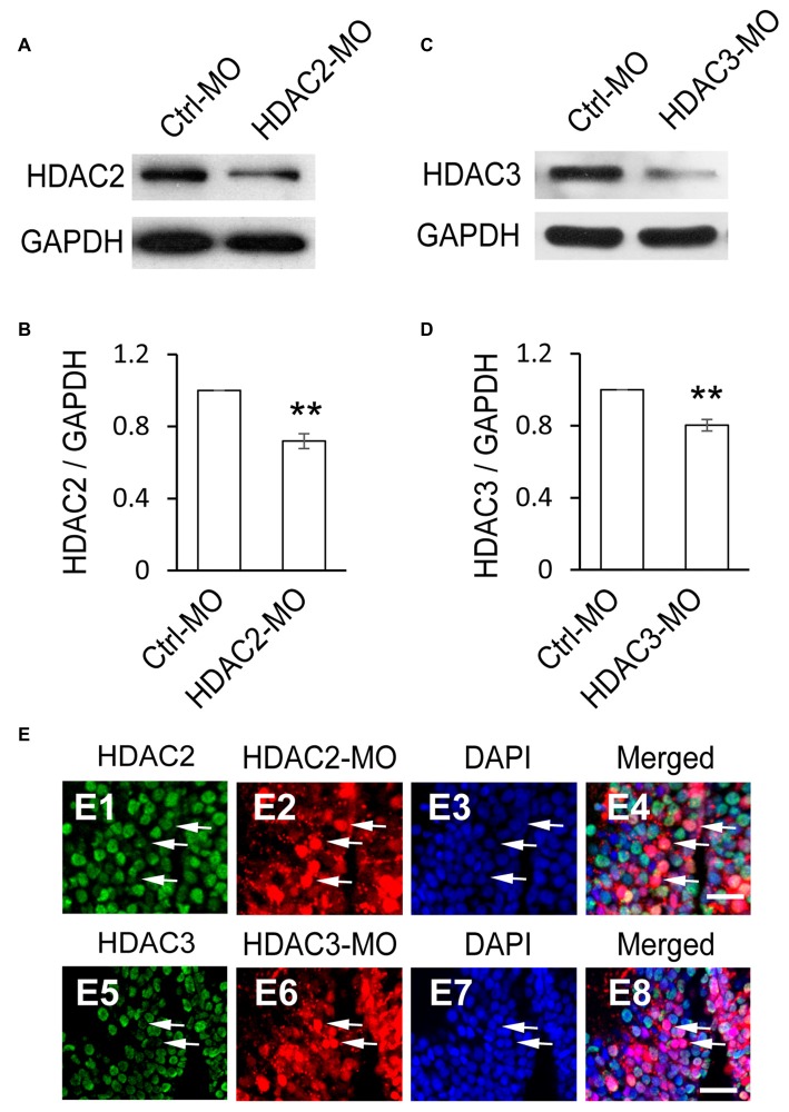 Figure 4. HDAC2 or HDAC3 expression is decreased by HDAC2-MO or HDAC3-MO knockdown. (A) Western blot analysis of homogenates from Ctrl-MO and HDAC2-MO transfected brains using an anti-HDAC2 antibody. (B) Quantification revealed that HDAC2 expression was significantly decreased in the HDAC2-MO transfected tectum compared to controls. (C) Ctrl-MO and HDAC3-MO transfected brain homogenates were compared using an anti-HDAC3 antibody. (D) HDAC3 expression was significantly decreased in the HDAC3-MO tectum. Data is represented as an intensity ratio of HDAC2 or HDAC3 to GAPDH normalized to the control value. Two-tailed T-test, N = 3, **p < 0.01. (E) Representative immunofluorescent staining of HDAC2 at HDAC2-MO-transfected cells (E1âE4) and HDAC3 at HDAC3-MO-transfected cells (E5âE8) in stage 48 tadpoles. Arrows indicate HDAC2/3-MO-transfected RGs stained for HDAC2/3. Scale: 20 μm.