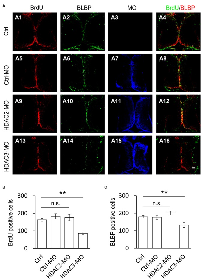 Figure 5. Number of BrdU+ cells is decreased by HDAC3 knockdown but not HDAC2 knockdown. (A) Representative immunofluorescence images of BrdU- and BLBP-labeled cells in control (A1âA4), Ctrl-MO (A5âA8), HDA2-MO (A9âA12) and HDAC3-MO (D13âD15) transfected brains in stage 48 tadpoles. Scale: 50 μm. (BâC) Summary data showing that HDAC3-MO, but not HDAC2-MO transfection dramatically decreased the number of BrdU- (B) and BLBP+ labeled cells (C). It was not significantly altered in Ctrl-MO tectum (B,C). (BrdU: Ctrl, 163.2 ± 7.9, N = 5, Ctrl-MO, 183.0 ± 14.6, N = 4, HDAC2-MO, 176.0 ± 18.6, N = 3, HDAC3-MO, 86.0 ± 7.8, N = 3; BLBP: Ctrl, 179.2 ± 7.2, N = 5, Ctrl-MO, 176.5 ± 11.5, N = 4, HDAC2-MO, 201.0 ± 11.4, N = 3, HDAC3-MO, 132.3 ± 13.8, N = 3; **p < 0.01).