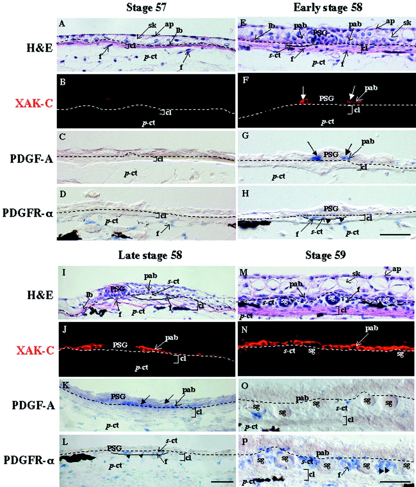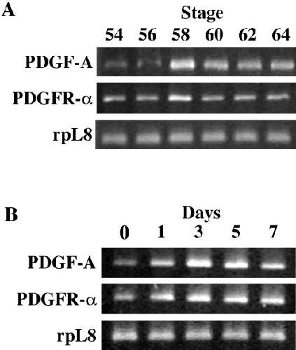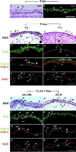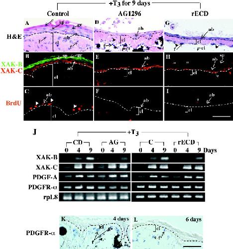 The anuran remodels the larval skin into the adult counterpart during metamorphosis. The construction of the precursor of adult epidermis (preadult epidermis) in Xenopus laevis larvae was coordinated with the development of the secondary connective tissue (s-ct) underneath the basement membrane, suggesting that the epithelial-mesenchymal interaction plays a critical role in the metamorphic conversion of the larval skin. mRNAs of platelet-derived growth factor A (PDGF-A) and PDGF receptor (PDGFR) -alpha were markedly up-regulated in the skin during spontaneous and thyroid hormone (TH) -induced metamorphosis. In situ hybridization experiments identified preadult epidermal basal cells and fibroblasts in developing subepidermal connective tissues at the late prometamorphic stage as PDGF-A and PDGFR-alpha mRNA-expressing cells, respectively. We developed an in vitro model of larval skin that was remodeled to the adult skin under the influence of TH. The presence of either of AG1296, a specific inhibitor of PDGFR tyrosine kinase autophosphorylation, or an excess of recombinant proteins of the soluble extracellular domain of PDGFR-alpha inhibited the following TH-induced processes, the proliferation of adult basal cells, the terminal differentiation of adult basal cells, and the activation of subepidermal fibroblasts. However, the inhibitors did not inhibit the TH-induced proliferation of preadult basal cells. We concluded that PDGF/PDGFR signaling is one of the prime cues in the epithelial-mesenchymal interaction required for the metamorphic skin remodeling.