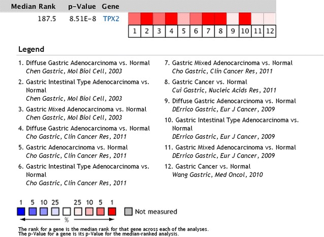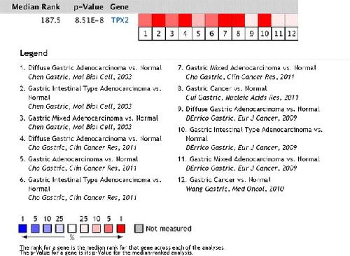 TPX2 expression is up-regulated in human gastric carcinomas in the Oncomine database. Oncomine heat map of TPX2 gene expression in clinical gastric carcinoma samples compared with normal gastric tissues (http://www.oncomine.org). In the meta-analysis, TPX2 expression was significantly higher than that in the corresponding normal tissues in gastric carcinoma, with a median rank of 187.5 and a p value of 8.51E−8
