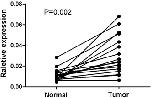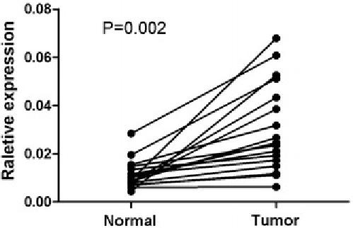 Fig. 2. Overexpression of TPX2 mRNA in gastric carcinoma tissues. Expression levels of TPX2 mRNA in 20 paired gastric carcinoma tissues according to real-time PCR. The results show that the expression levels of TPX2 mRNA were significantly higher in tumor tissues than in the paired normal tissues (P = 0.002). Normal, matched adjacent non-tumor gastric tissues. Tumor, gastric carcinoma tissues. GAPDH was used as the internal control