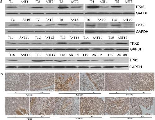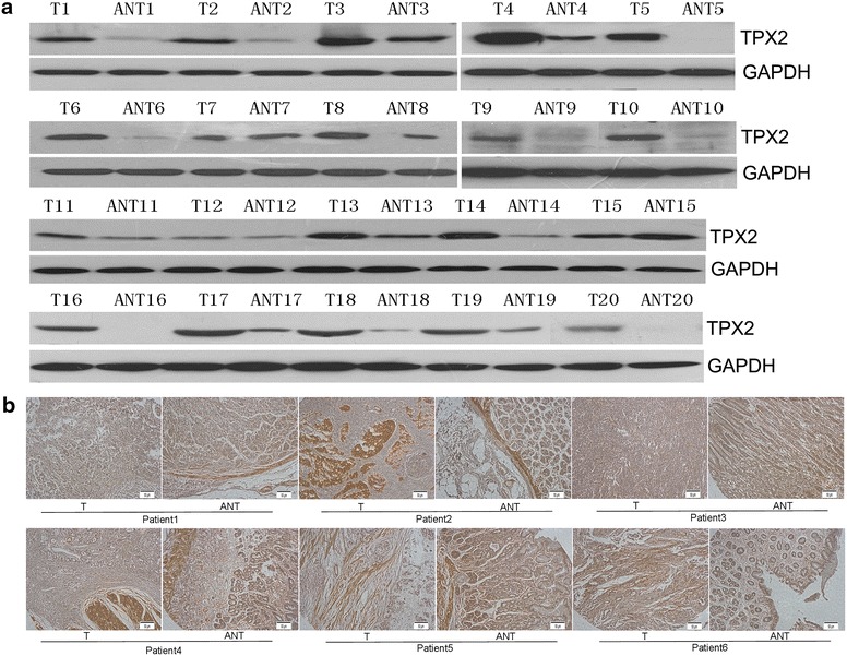 Fig. 3. Overexpression of TPX2 protein in human gastric carcinoma tissues. a Western blot analyses of TPX2 protein expression in twenty matched pairs of gastric carcinoma (T) and adjacent noncancerous tissues (ANT). GAPDH was used as the loading control. b Immunohistochemical assay of TPX2 protein expression in six pairs of matched gastric carcinoma tissues. T gastric carcinoma tissues, ANT matched adjacent non-tumor gastric tissues (×400)