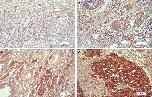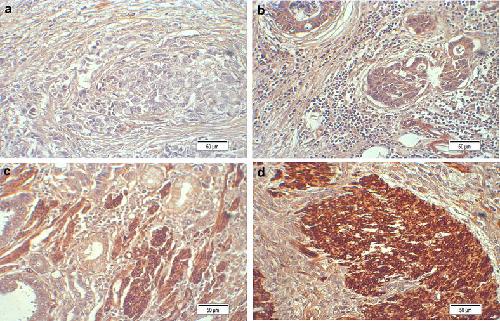 Fig. 4. Expression analysis of TPX2 protein by immunohistochemistry. TPX2 expression was mainly localized in the nucleus and cytoplasm of tumor cells. a Staining of TPX2 in normal gastric tissues (×400). b Low expression of TPX2 in gastric carcinoma tissues (stage II) (×400). c Medium expression of TPX2 in gastric carcinoma tissues (stage III) (×400). d Higher expression of TPX2 in gastric carcinoma tissues (stage IV) (×400)