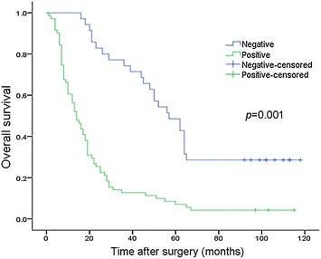 Fig. 5. Correlation of TPX2 expression with patient overall survival in gastric carcinoma. Kaplan–Meier curves with univariate analysis (log-rank). OS rates for cases with high TPX2 expression versus those with low TPX2 expression levels in all patients. High TPX2 expression was correlated with an unfavorable prognosis (P = 0.001)