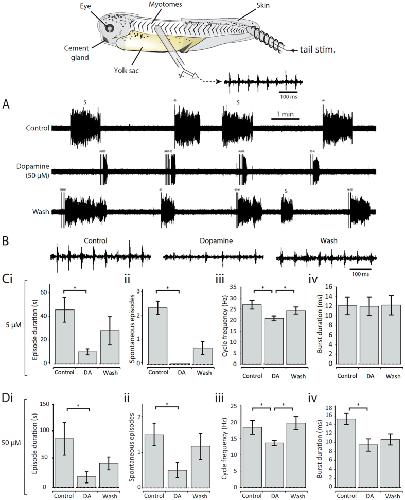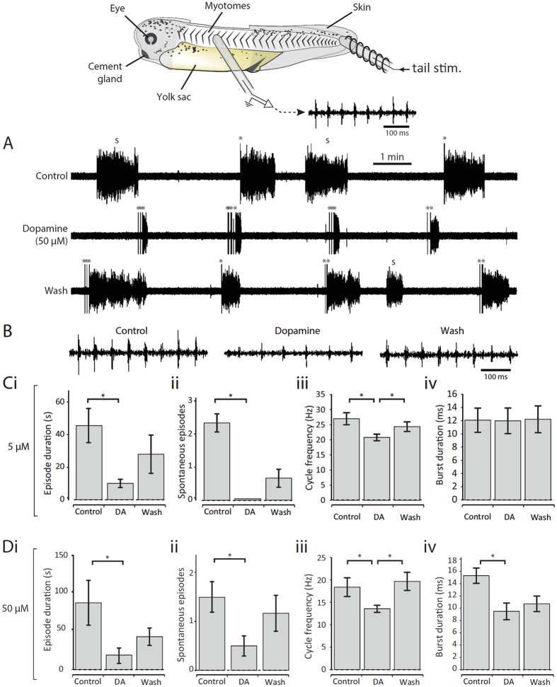 Figure 1. Dopamine inhibits fictive swimming across a range of concentrations.Top: The experimental preparation. (A) Raw traces showing evoked and spontaneous episodes of fictive swimming in control, in the presence of 50 μM dopamine and after dopamine wash-out. “s” denotes spontaneous swim episodes and “*” denotes tail stimulus. (B) Raw traces showing 500 ms of activity at the start of an evoked episode in control, in dopamine (50 μM) and after dopamine washout. Note that the swimming is slower and weaker in dopamine compared to control and wash. (C) A low concentration of dopamine (5 μM) significantly reduced episode duration (i: p < 0.05, n = 6); the number of spontaneous episodes of swimming (ii: p < 0.05, n = 3); and swim frequency (iii: p < 0.05, n = 6). (D) A high concentration of dopamine (50 μM) was also inhibitory and significantly reduced episode duration (i: p < 0.05, n = 8); the number of spontaneous episodes of swimming (ii: p < 0.05, n = 6); swim frequency (iii: p < 0.05, n = 8); and burst durations (ii; p < 0.05, n = 5).