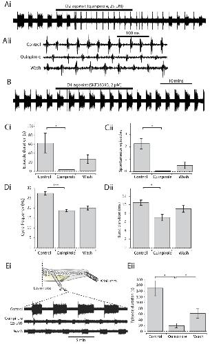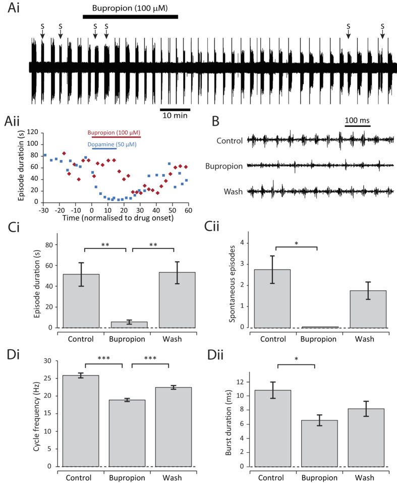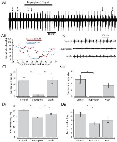 Figure 3. Endogenously released dopamine inhibits swimming.(Ai) Raw trace of fictive swimming showing an entire 2 hour experiment. The application of 100 μM bupropion clearly inhibited swimming after approximately 20 minutes. (Aii) A comparison of the effect onset in a bupropion experiment and a dopamine experiment. (B) Raw traces showing 500 ms of activity at the start of an evoked episode in control, 100 μM bupropion, and following drug washout. (C) Bupropion (100 μM) significantly reduced episode duration (i: p < 0.01, n = 13) and the number of spontaneous episodes of swimming (ii: p < 0.05, n = 4). (D) Bupropion (100 μM) also significantly reduced swim frequency (i: p < 0.001. n = 13) and burst durations (ii: p < 0.05. n = 5).