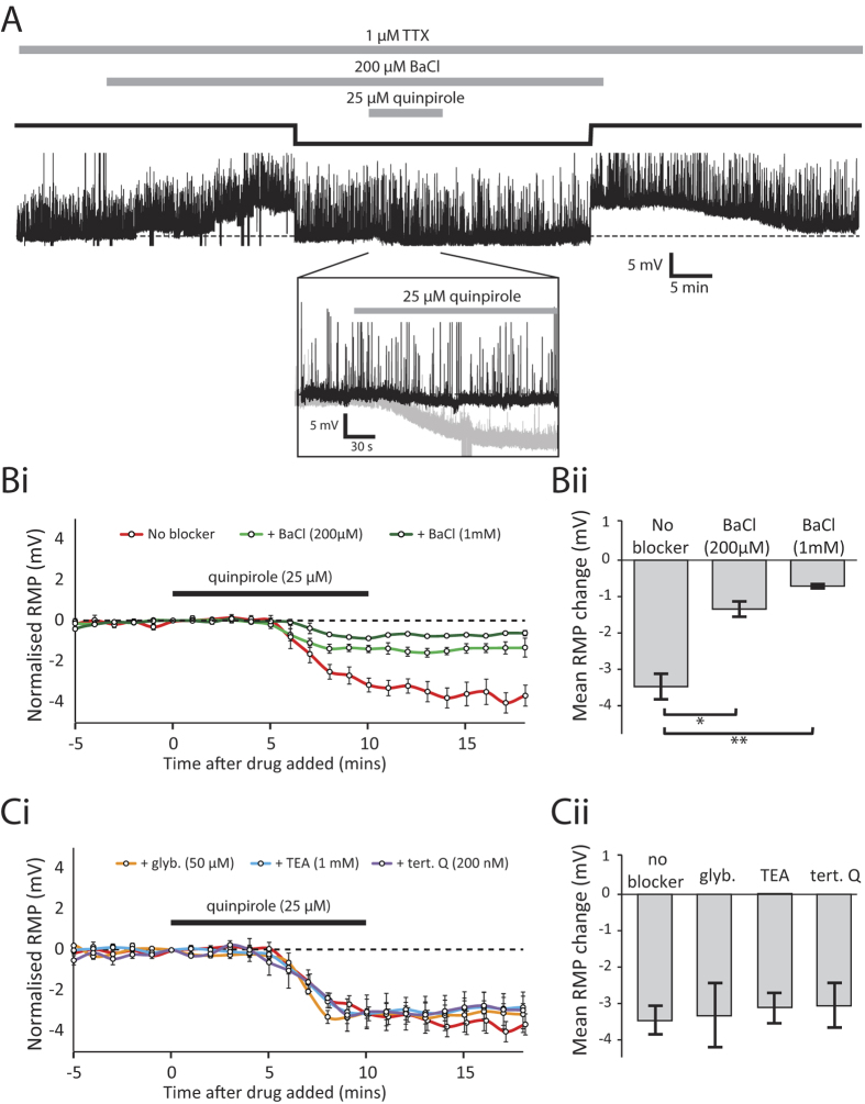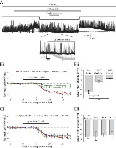Figure 6. Barium chloride (BaCl), but not other potassium channel blockers, occludes the D2-like receptor mediated hyperpolarisation of spinal CPG neurons.(A) A representative intracellular recording showing the effects of 25 μM quinpirole in the presence of TTX and BaCl. Application of 200 μM BaCl depolarised the cell by approximately 4 mV before stabilising, at which point the membrane potential was corrected to control (dashed line) using DC current injection (solid black line). Quinpirole (25 μM) had only a small (<1 mV) hyperpolarising effect when subsequently applied in the presence of BaCl. The inset shows an expansion of the main trace. The effect of quinpirole alone is illustrated as a faded trace for comparison. (Bi) Timecourse showing the resting membrane potential, pooled and normalised into 1 minute bins, to illustrate the hyperpolarising effect of quinpirole (25 μM) under control conditions (red), in the presence of 200 μM BaCl (light green) and in the presence 1 mM BaCl (dark green). (Bii) Pooled data showing a significantly smaller hyperpolarisation in both 200 μM BaCl (p < 0.05, n = 4) and 1 mM BaCl (p < 0.01, n = 3) compared to control. (Ci) Timecourse plot showing the quinpirole hyperpolarisation in a range of other K+ channel blockers. (Cii) Various K+ channel blockers, including TEA, glybenclamide and tertiapin-Q showed no significant occlusion of the quinpirole effect.