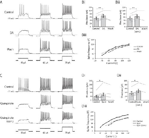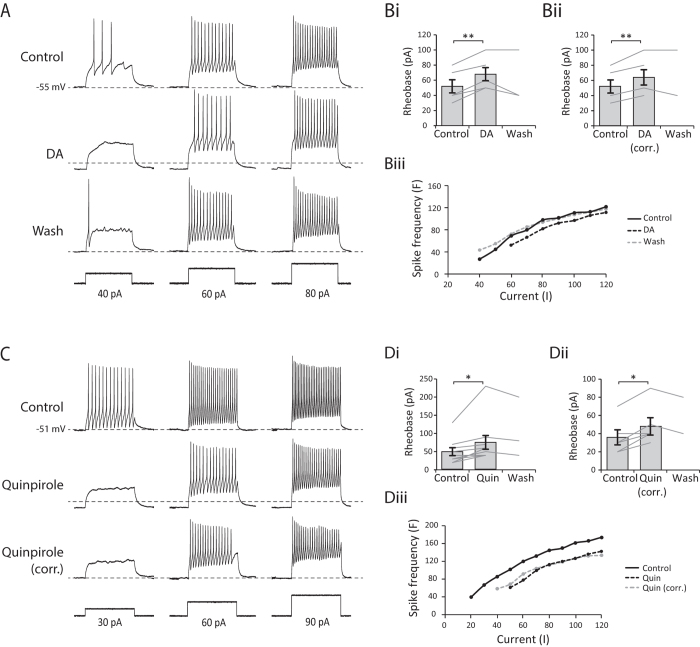 Figure 8. The activation of D2 receptors modifies the integrative electrical properties of spinal CPG neurons.(A) An example of the cellular response to depolarising current pulses in control, in 50 μM DA and following washout of dopamine. (Bi) Pooled data showing that dopamine significantly increases rheobase (p < 0.01, n = 5). (Bii) The effect persists when the RMP of the cell is corrected to control value using DC current injection (p < 0.01, n = 5). (Biii) F-I plot for the cell shown in A. Dopamine shifted the FI curve to the right, demonstrating reduced firing frequency in response to the same current input. (C) Responses to depolarising current pulses in control, in 25 μM quinpirole and following washout of quinpirole. (Di) Pooled data showing that quinpirole also significantly increases rheobase (p < 0.05, n = 9), which persisted when the RMP was corrected (Dii, p < 0.05, n = 5). (Diii) F-I plot for the cell shown in (C). Quinpirole shifted the FI curve to the right, demonstrating reduced firing frequency in response to the same current input.
