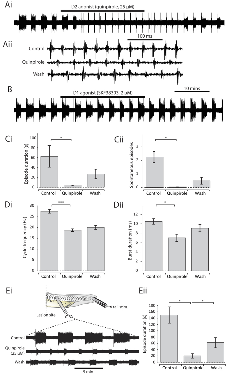 Figure 2. The inhibitory effects of dopamine on the swim network are mediated via spinal D2-like receptors.(Ai) Raw trace showing the effect of the D2-like agonist quinpirole (25 μM) on fictive swimming. (Aii) Raw trace showing a 500 ms excerpt of activity in control, in the presence of quinpirole, and after washout. (B) Raw trace showing the lack of effects of the D1-like agonist SKF38393 (2 μM). (C) Quinpirole (25 μM) significantly reduced episode duration (i: p < 0.05, n = 9) and the number of spontaneous episodes of swimming (ii: p < 0.05, n = 4). (D) Quinpirole (25 μM) also significantly reduced swim frequency (i: p < 0.001, n = 9) and burst durations (ii; p < 0.05, n = 6). (E) Quinpirole (25 μM) still had an inhibitory effect in tadpoles that had been spinalised at the level of the 2nd post-otic intermyotomal cleft, suggesting that inhibitory D2-like receptors are present in the spinal cord.