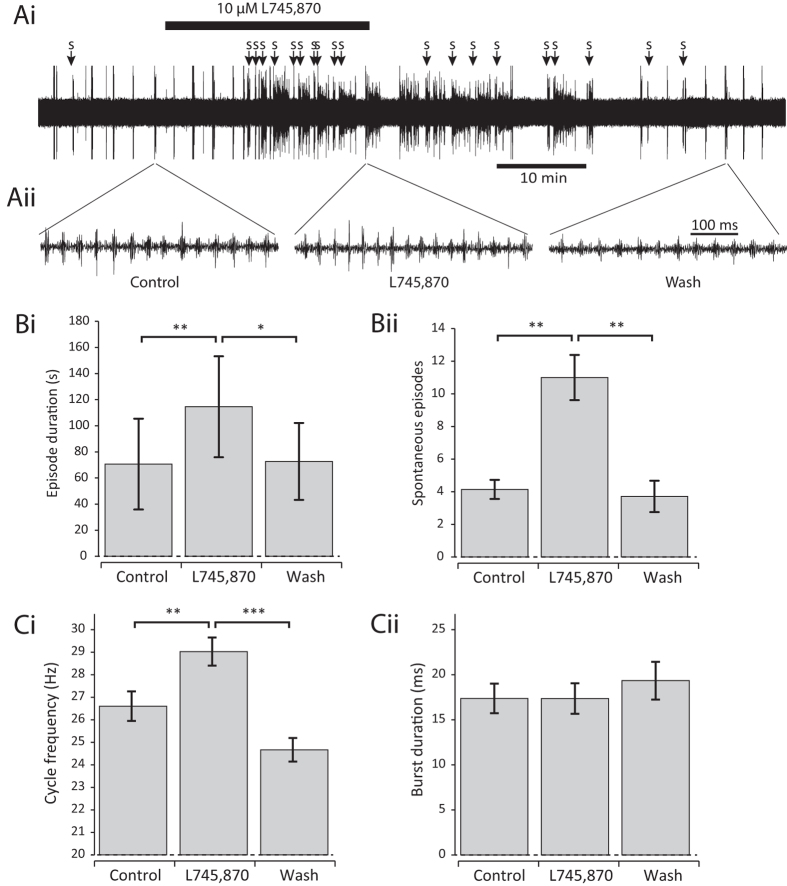 Figure 4. The D4 antagonist L745,870 has the opposite effects to dopamine and quinpirole.(Ai) Raw trace of fictive swimming showing an entire experiment. The application of 10 μM L745,870 has a clear excitatory effect on swimming. (Aii) Raw traces showing ~500 ms of activity at the start of an evoked episode in control, 10 μM L745,870, and following drug washout. B: L745,870 (10 μM) significantly increased episode duration (i: p < 0.01, n = 8) and the number of spontaneous episodes of swimming (ii: p < 0.01, n = 7). C. L745,870 (10 μM) also significantly reduced swim frequency (i: p < 0.01. n = 8) but had no significant effect on burst durations (ii: p > 0.05. n = 7).