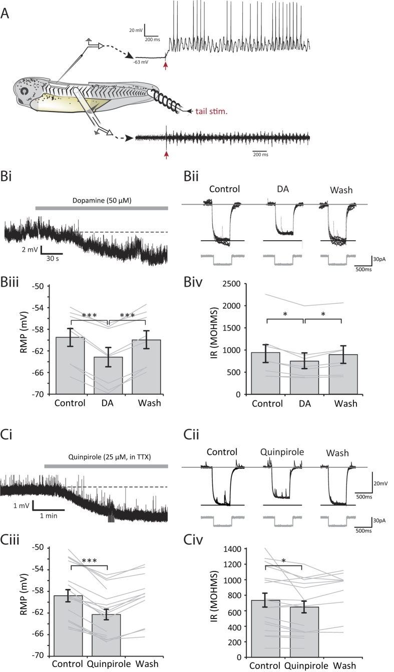 Figure 5. Activation of D2-like receptors hyperpolarises rhythmically active spinal neurons and decreases their input resistance.(A) The experimental preparation for making patch clamp recordings with simultaneous ventral root recordings. An intracellular recording of a rhythmically active spinal neuron is shown, with the ventral root trace shown below. The cell is the same as shown in (Ci). (Bi) Representative trace showing a hyperpolarisation caused by 50 μM dopamine in a rhythmically active spinal neuron. (Bii) Traces showing the membrane response to a 20 pA hyperpolarising current pulse under each condition. Six responses (sweeps) are overlaid for each condition. (Biii) Pooled data showing a significant hyperpolarisation of resting membrane potential in the presence of 50 μM dopamine (n = 8, p < 0.001) which significantly reversed upon washout (p < 0.001). (Biv) Pooled data showing a significant reduction in input resistance in the presence of dopamine (n = 8, p < 0.05) which significantly reversed upon washout (p < 0.05). (Ci) Representative trace showing a hyperpolarisation caused by 25 μM quinpirole in the presence of TTX. Note also the reduction in frequency of spontaneous synaptic potentials. (Cii) Traces showing membrane responses to a 20 pA hyperpolarising current pulse. Six responses (sweeps) are shown overlaid for each condition. (Ciii) Pooled data showing a significant hyperpolarisation in the presence of 25 μM quinpirole (n = 18, p < 0.001). (Civ) Pooled data showing a significant reduction in input resistance in the presence of quinpirole (n = 18, p < 0.05).