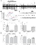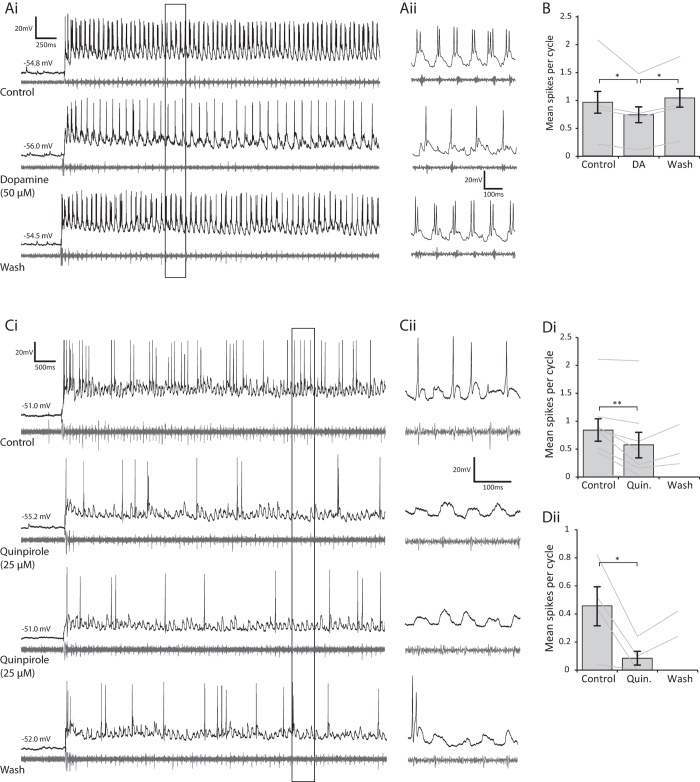 Figure 7. Activation of D2-like receptors leads to a reduction in spike reliability during swimming.(Ai) Raw traces showing an intracellular recording of a cIN (black) and below that the ventral root trace (grey) in control, in the presence of dopamine (50 μM) and following dopamine washout. (Aii) The inset shows an expansion of the trace in Ai as indicated by the black box. (B) Pooled data shows that 50 μM dopamine significantly reduced the reliability of spiking during swimming (p < 0.05, n = 7), which reverses significantly upon washout of dopamine. (Ci) Raw trace of a recording from an aIN in control, in the presence of quinpirole (10 μM) both without and with corrected RMP, and following quinpirole washout. (Cii) The inset shows 250 ms of activity from the black box in Ci. Pooled data shows that quinpirole significantly reduced the reliability of spiking during swimming both without (Di, p < 0.01, n = 8) and with corrected RMP (Dii, p < 0.05, n = 4).