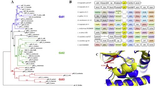 always present close to GDI3. (C) Two substitution sites in GDI3 compared to GDI1 (Y117H and N130D, shown in red) when plotted against the tertiary structure map to the flanking
